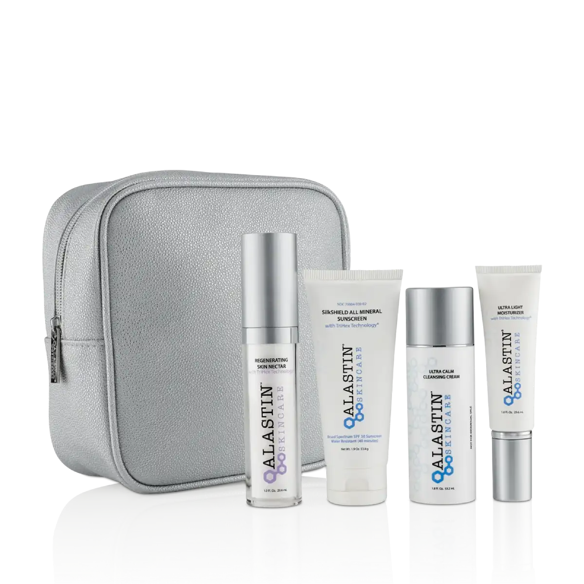 Regenerating Skin Nectar (full size) – 1.0 Fl. Oz. 29.6 mL | Ultra Light Moisturizer (travel size) – 1.0 Fl. Oz. 59.1 mL | Ultra Calm Cleansing Cream (travel size) – 1.8 Fl. Oz. 53.2 mL | SilkSHIELD All Mineral Sunscreen SPF 30 (full size) – 1.9 Fl Oz. 53.8 mL